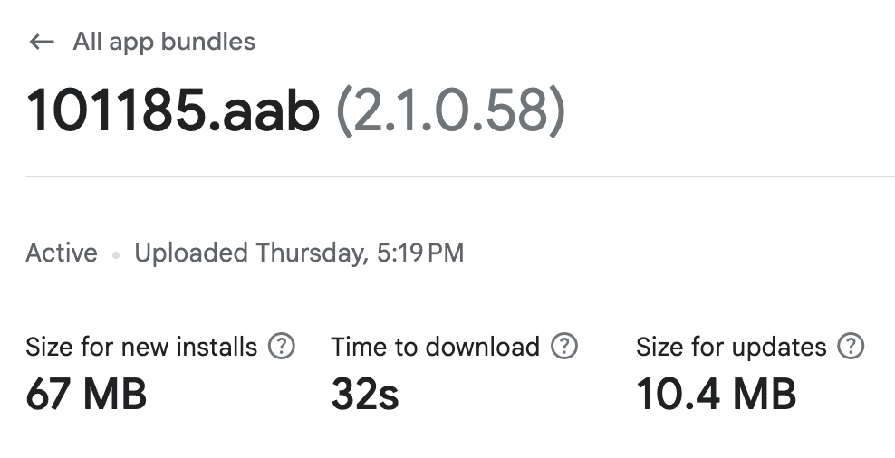 - After uploading, open the App Bundle details page to view the estimated download size for new installs (the image below corresponds to the Lens Demo app using the full Lens SDK flavor).